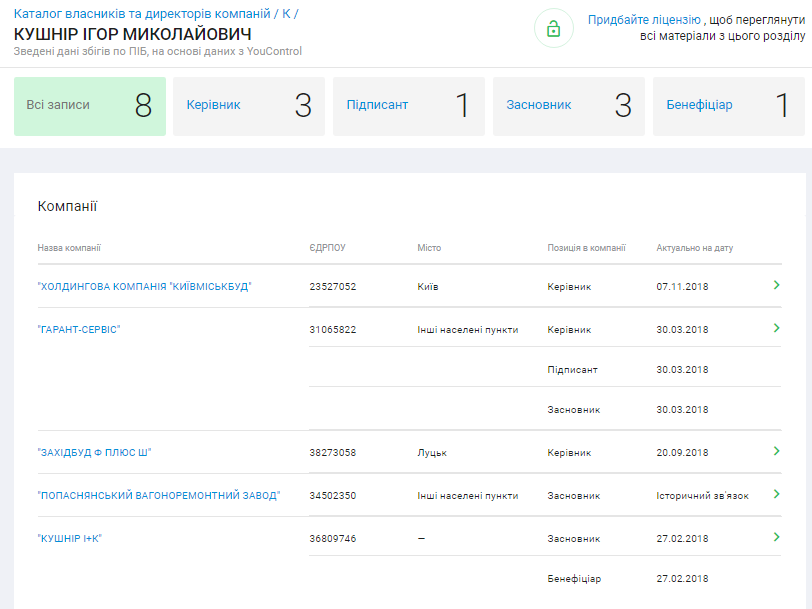 Щодо компаній, якими володіє: в трьох є керівником, у трьох – власник і в одній – бенефіціар.