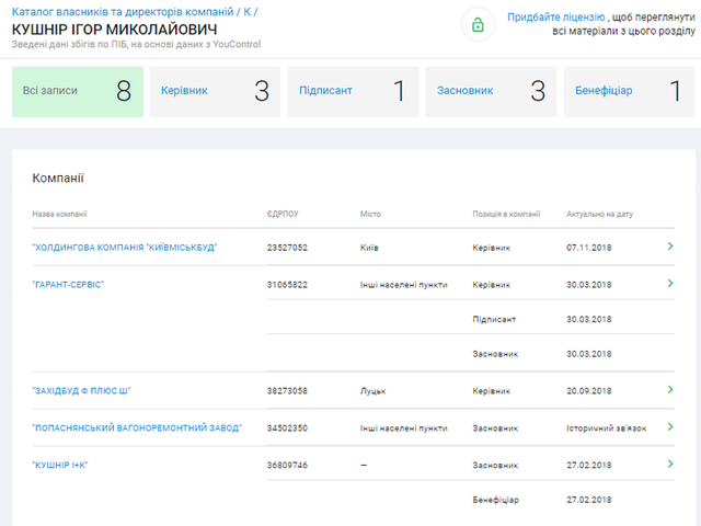 Щодо компаній, якими володіє: в трьох є керівником, у трьох – власник і в одній – бенефіціар.