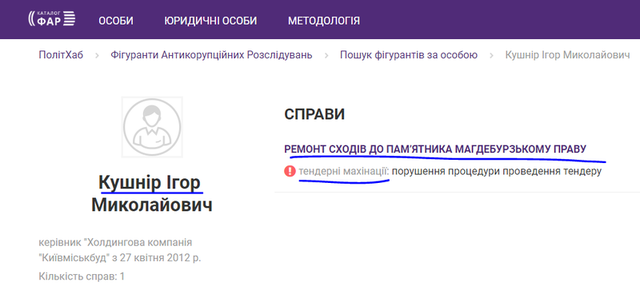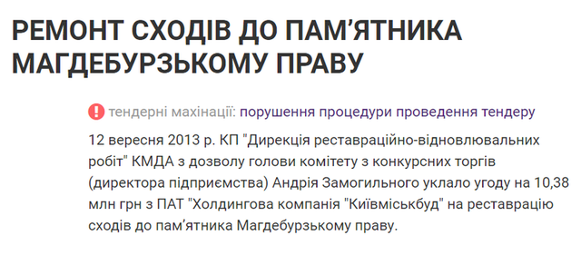 Інформаційний ресурс «Чесно» зафіксував тендерні махінації, пов’язані з ремонтом сходів до пам’ятника Магдебурзькому праву. Йшлося про порушення процедур проведення тендеру.