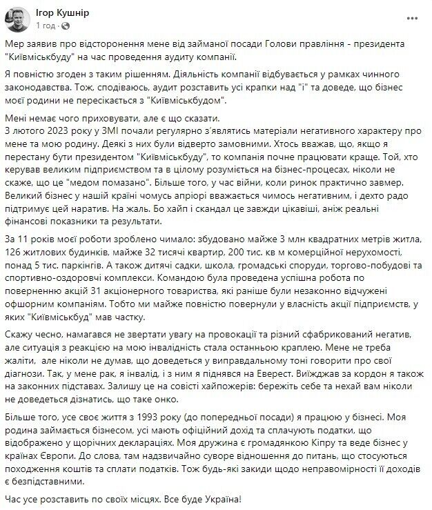 Летом 2023 года наблюдательный совет и правление “Киевгорстроя” решили провести аудит компании с привлечением одной из ведущих международных аудиторских фирм. Игорь Кушнир был отстранен от работы, а позже он подал заявление на увольнение и написал об этом на своей странице в Facebook.