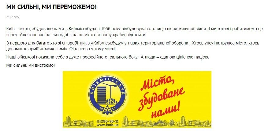 То есть в 2022 году, когда все работали на армию, а на официальной странице “Киевгорстроя” писались патриотические лозунги о помощи,