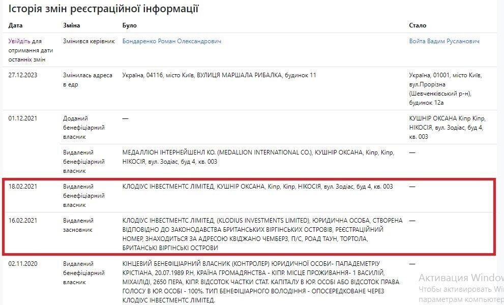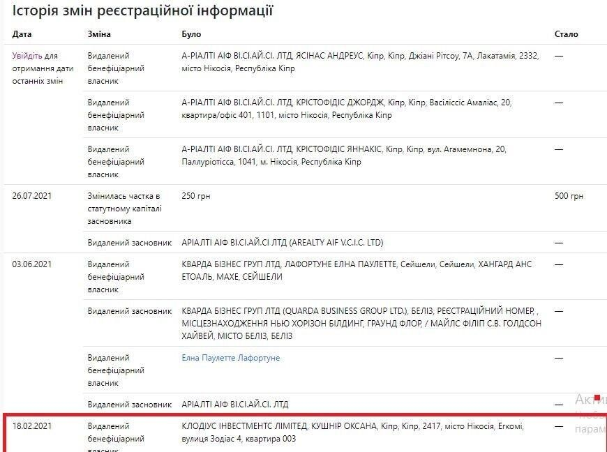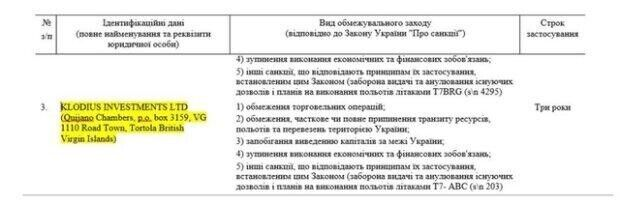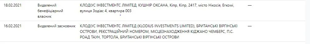Но это еще не все. Среди субъектов, оказавшихся 19 февраля 2021 года под санкциями Совета национальной безопасности и обороны Украины, была компания Klodius Investments Limited. Эта компания зарегистрирована на Британских Виргинских Островах и является собственностью гражданки Кипра Оксаны Кушнир.